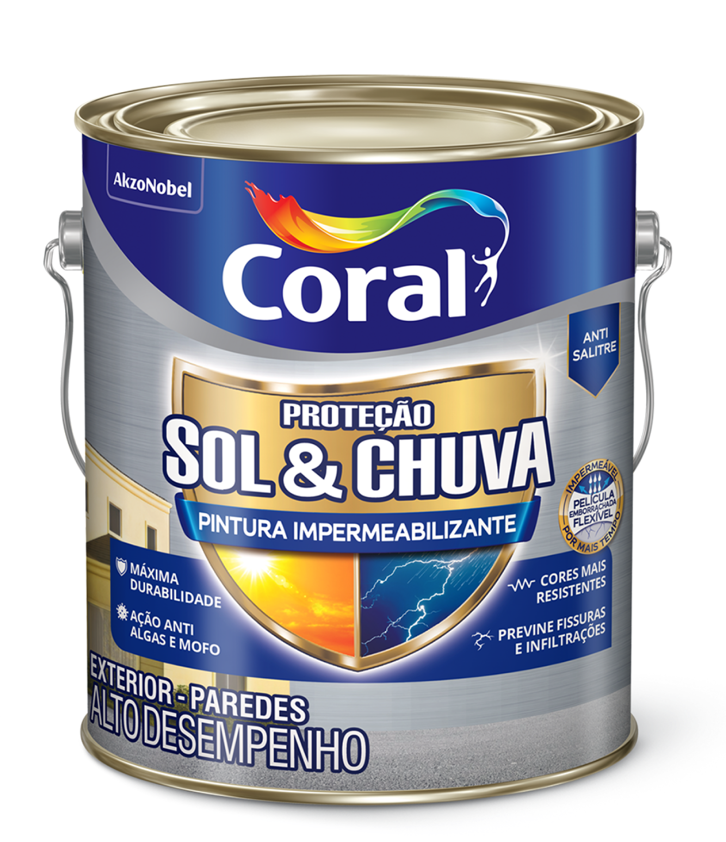Proteção Sol & Chuva Pintura Impermeabilizante é a opção mais completa para pintar e proteger paredes externas, pois forma uma película emborrachada flexível que previne fissuras e infiltrações, combate algas & mofo, além de conferir máxima durabilidade e resistência a suas cores, que são mais resistentes. É formulado para ser aplicado diretamente em paredes novas ou reboco, pois bloqueia o aparecimento do salitre, permitindo que a pintura seja realizada quando a superfície estiver visivelmente seca, sem a necessidade de esperar o tempo de cura ou aplicar fundos Rende até 85m² acabados por embalagem de 18L.